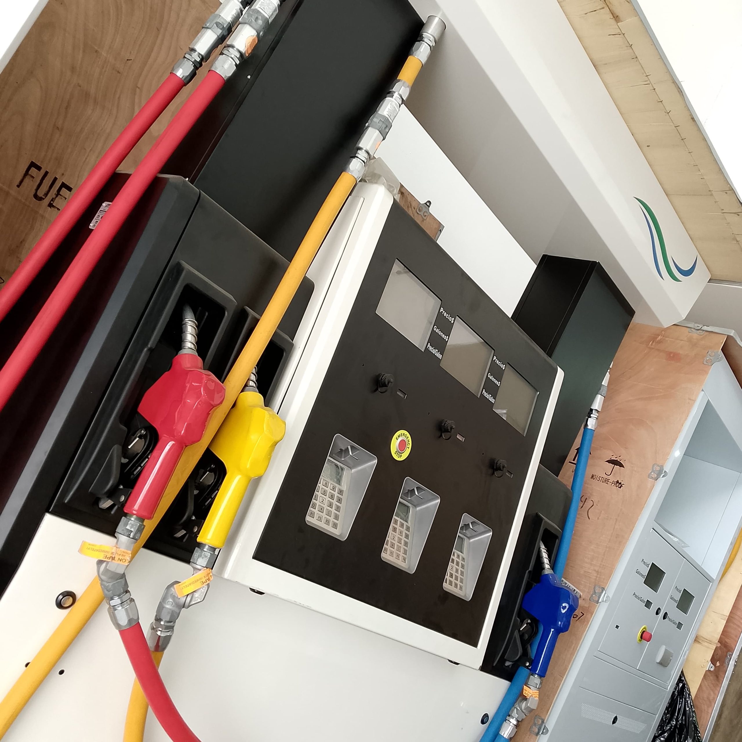 Dispensador 6 mangueras 3 productos de Combustible tipo Conexión a Bomba sumergible, 50L/min, impresoras con letras en Español/ DisplaysLCD,8+8+5 formato/precio:12345678,galones:12345.678,precio/galón:12345,/filtros3/4″/válvulas solenoide 3/4″NPToutlet/front outlet/válvulas breakaway OPW UL/swivel OPW UL/pistolas11B,3/4″NPT UL/(hook)metálico/mangueras y pistolas color:amarillo y Rojo /batterybackup.Alimentación:110v-220v 60Hz,Comunicación por software/color blanco. Certificación OIML y CE bajo la directiva del concejo europeo 2014/32/EU